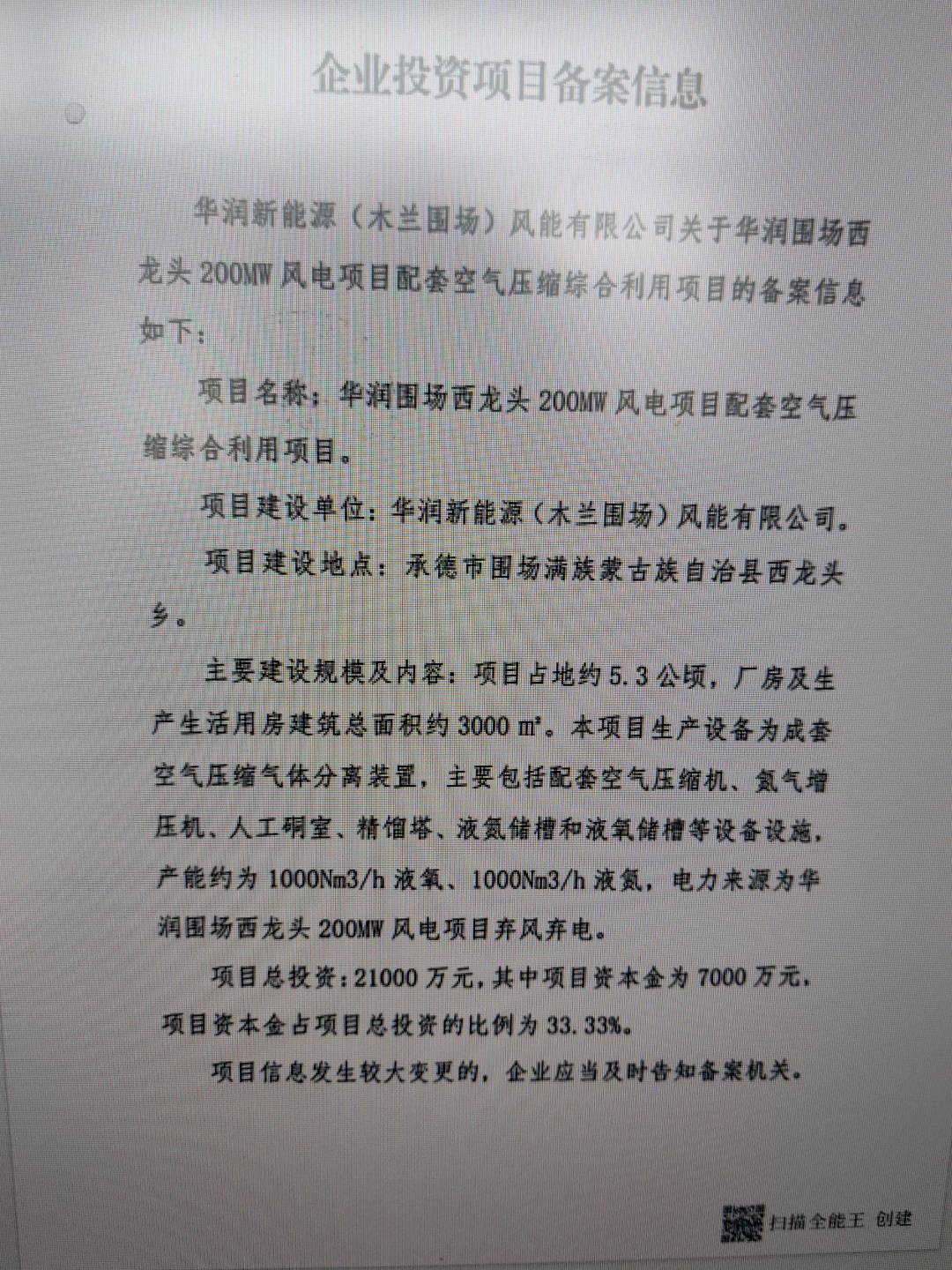 | 项目名称 | 华润新能源(木兰围场)风能有限公司华润围场绿 色气体分离示范项目 | ||||