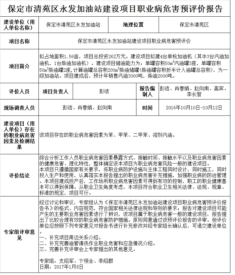 保定市清苑区永发加油站建设项目职业病危害预评价